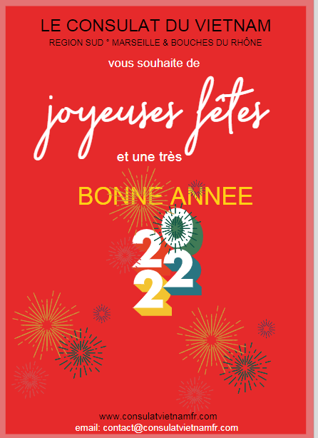 ConsulatVietnam-MrsFR Bonne Année 2022 Date: 25 décembre 2021Author: consulatvietnam13 Partager : Partager sur X(ouvre dans une nouvelle fenêtre) X Partager sur Facebook(ouvre dans une nouvelle fenêtre) Facebook J’aime chargement… Similaire