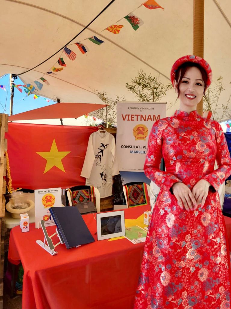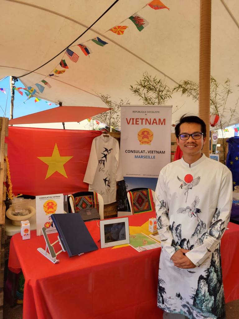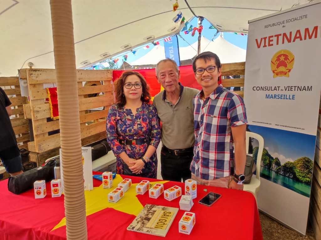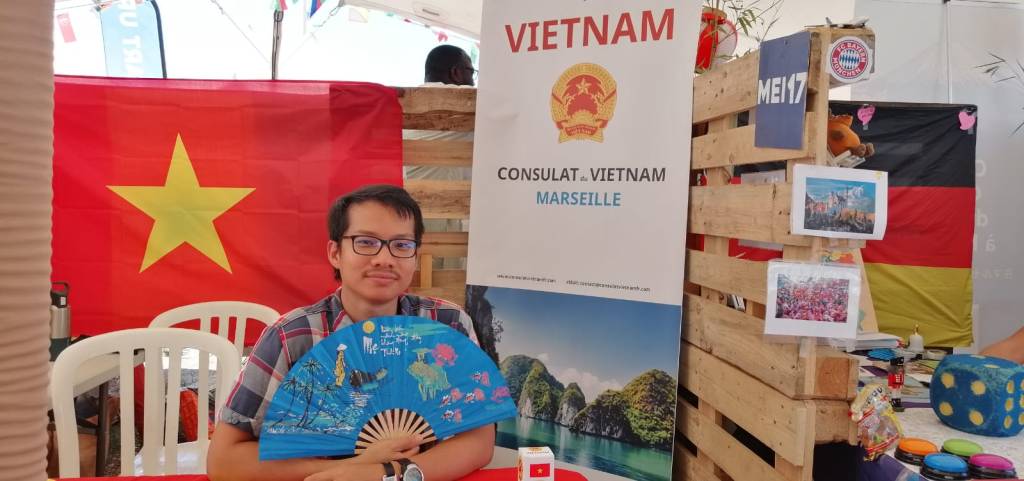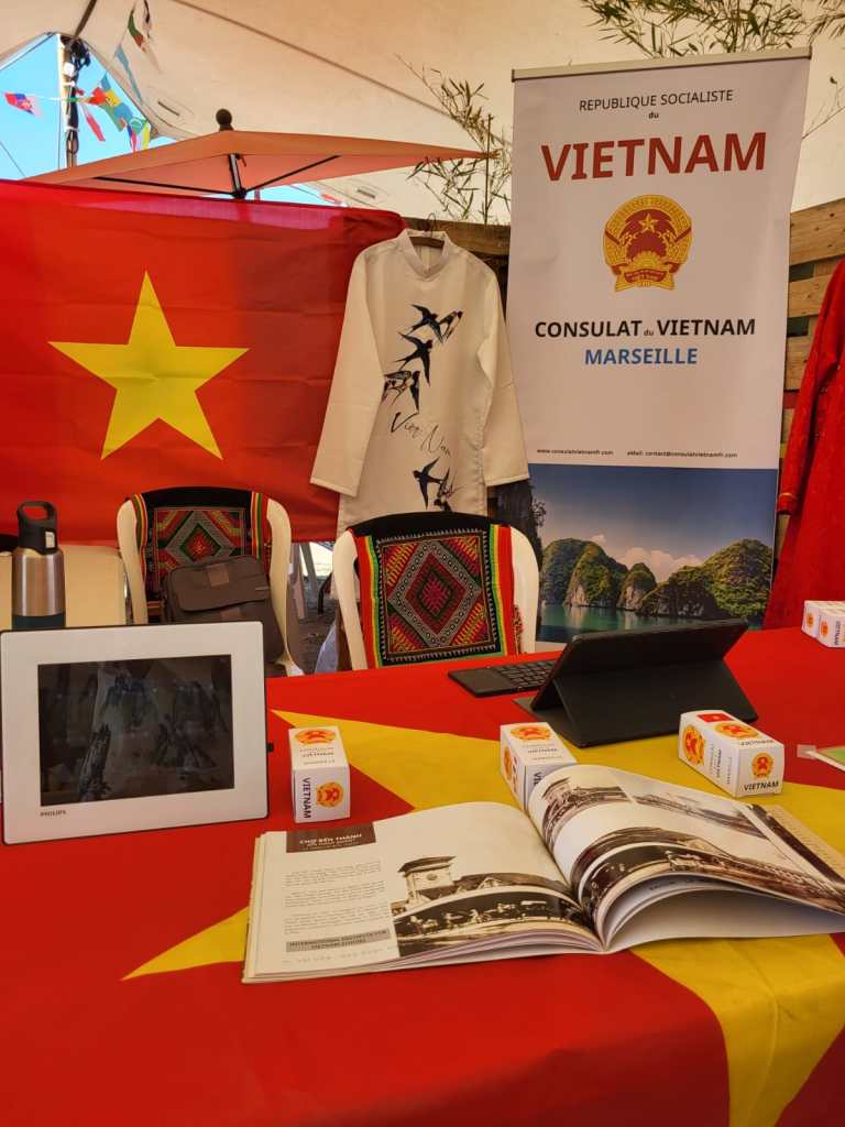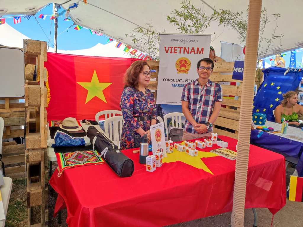 Le Vietnam était représenté avec le stand du Consulat du Vietnam à Marseille & Bouches-du-Rhône. Nos intervenants et animateurs, M. Hùng Hervé, Mme Nhàn, M. Phan Trong Lê, Miss Câm Lâm, entre mercredi et dimanche, étaient présents pour répondre aux demandes des nombreux festivaliers en quête d’informations sur le Vietnam, questions sur les visites touristiques, opportunités d’études et d’échanges universitaires, perspectives d’emploi dans les domaines de l’ingénierie et du commerce, sans oublier les spécialités culinaires