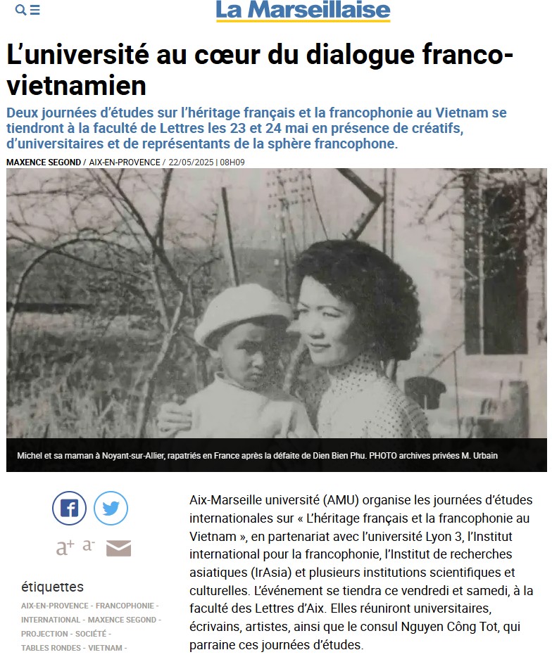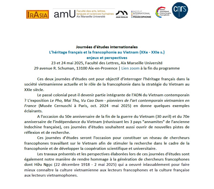 (23-24 mai 2025 – Aix-en-Provence) Journées d’études internationales » Héritage français et francophonie au Vietnam XX°-XXI° siècles. L’Université au coeur du dialogue franco-vietnamien – Faculté de Lettres d’Aix-Marseille AMU. Deux jours de réflexions, de débats, et de créations. Un grand bravo à Mme Jade Thi Phuong Ngoc NGUYEN et toute l’équipe de la fac de Lettres pour cette super organisation!